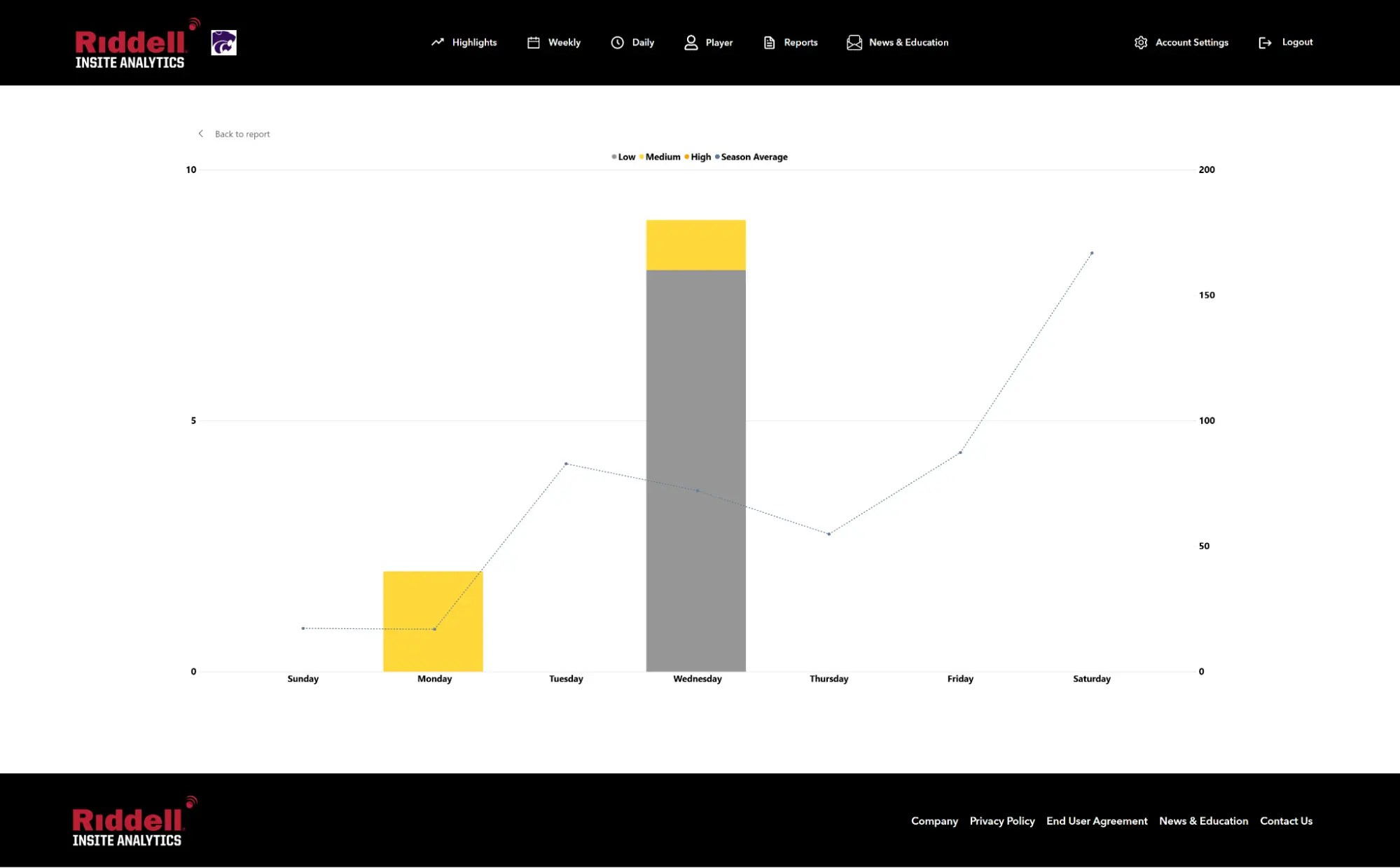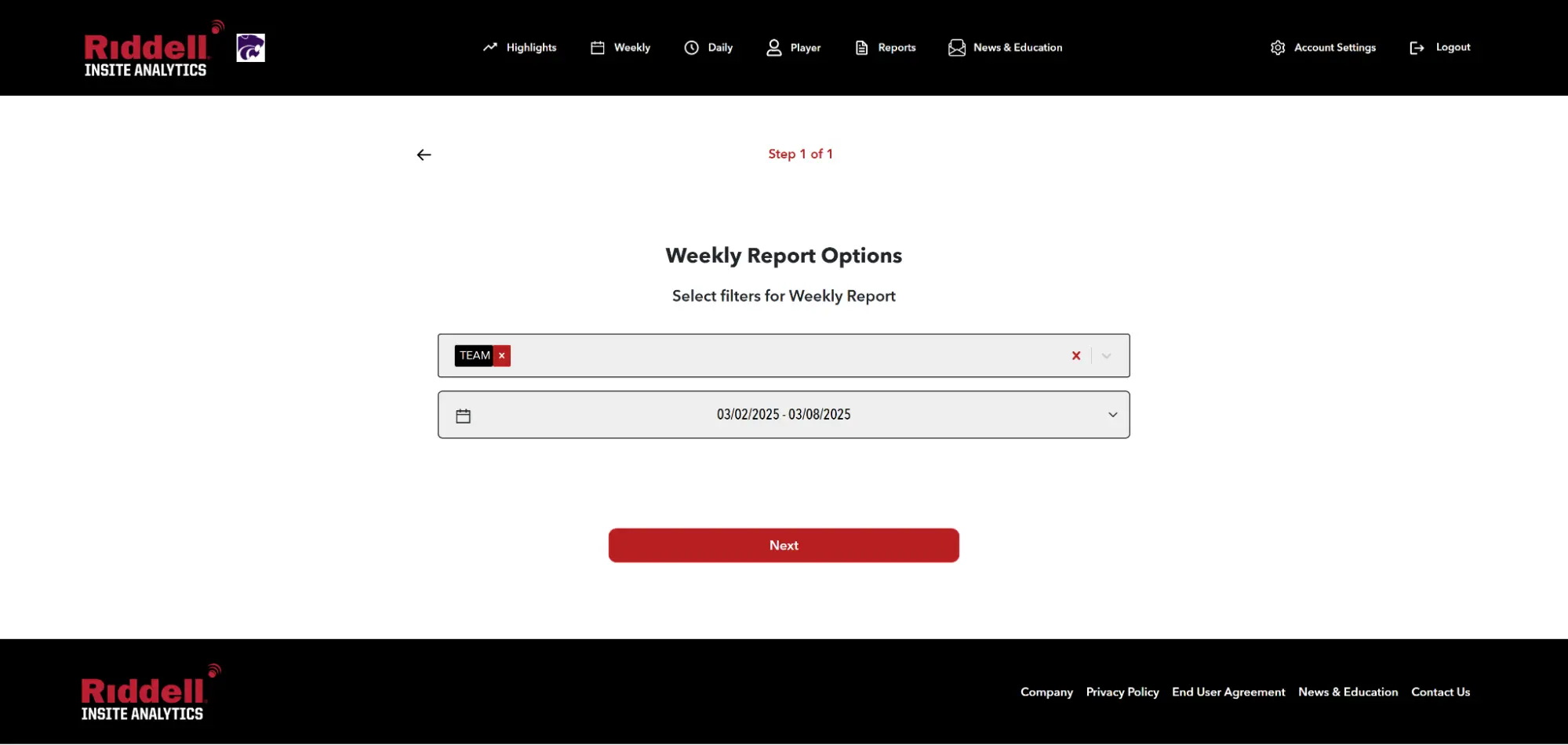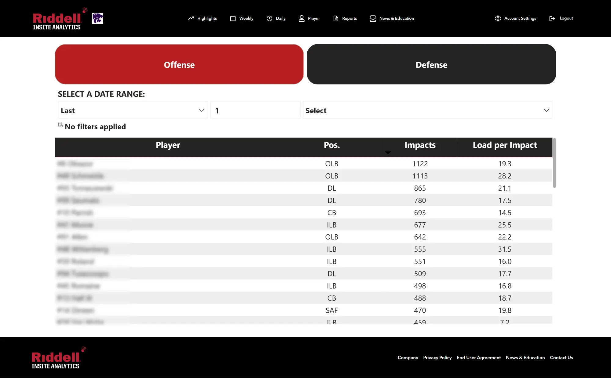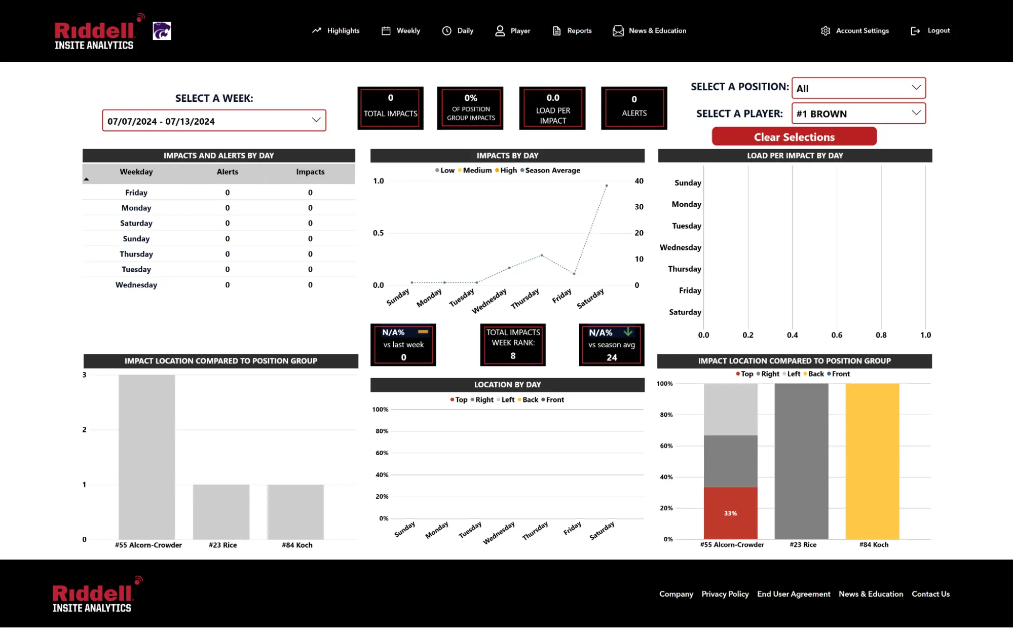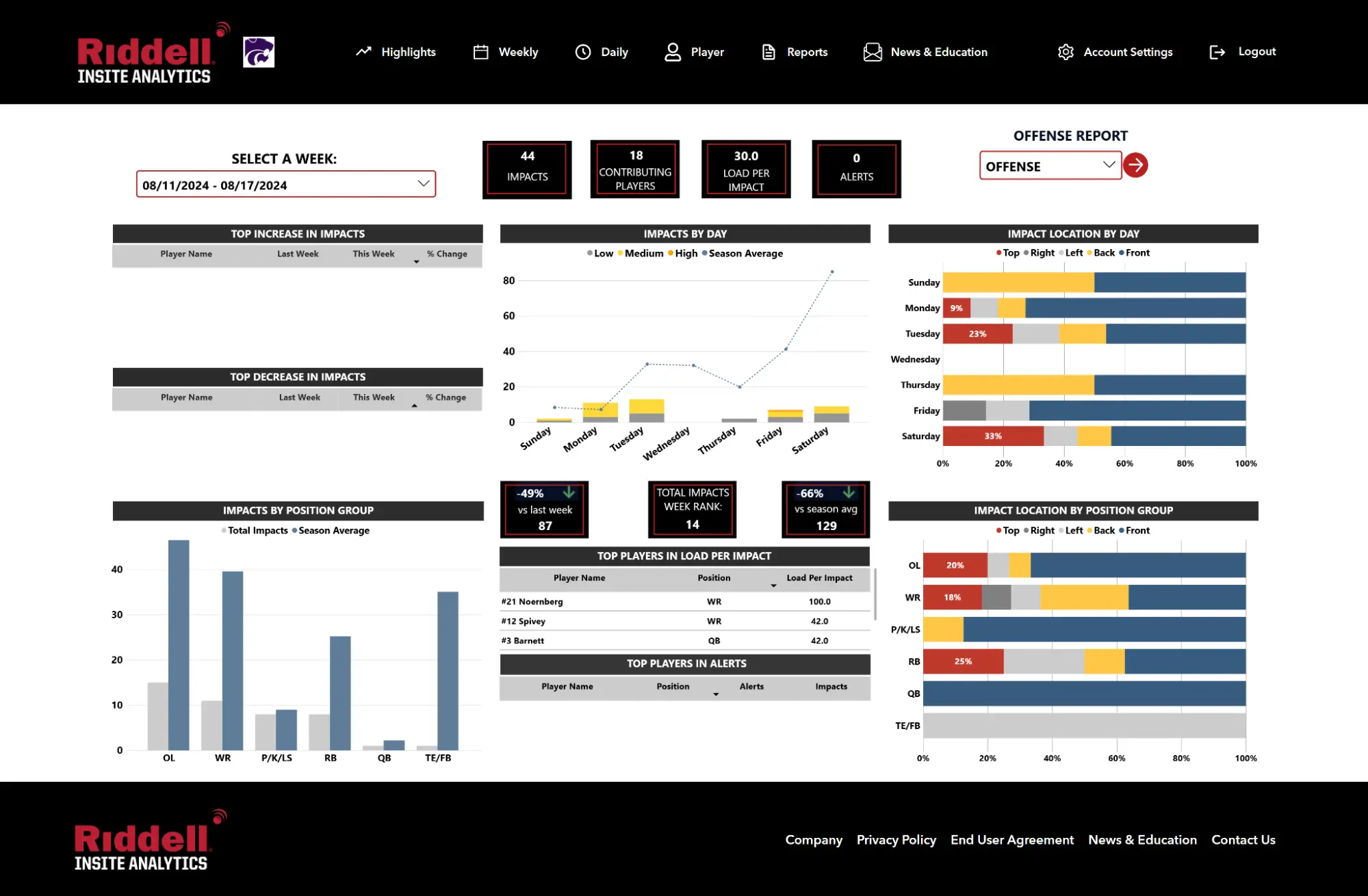 The Player Weekly Report offers detailed impact analysis for individual players, allowing coaches and staff to monitor performance and safety trends on a weekly basis.