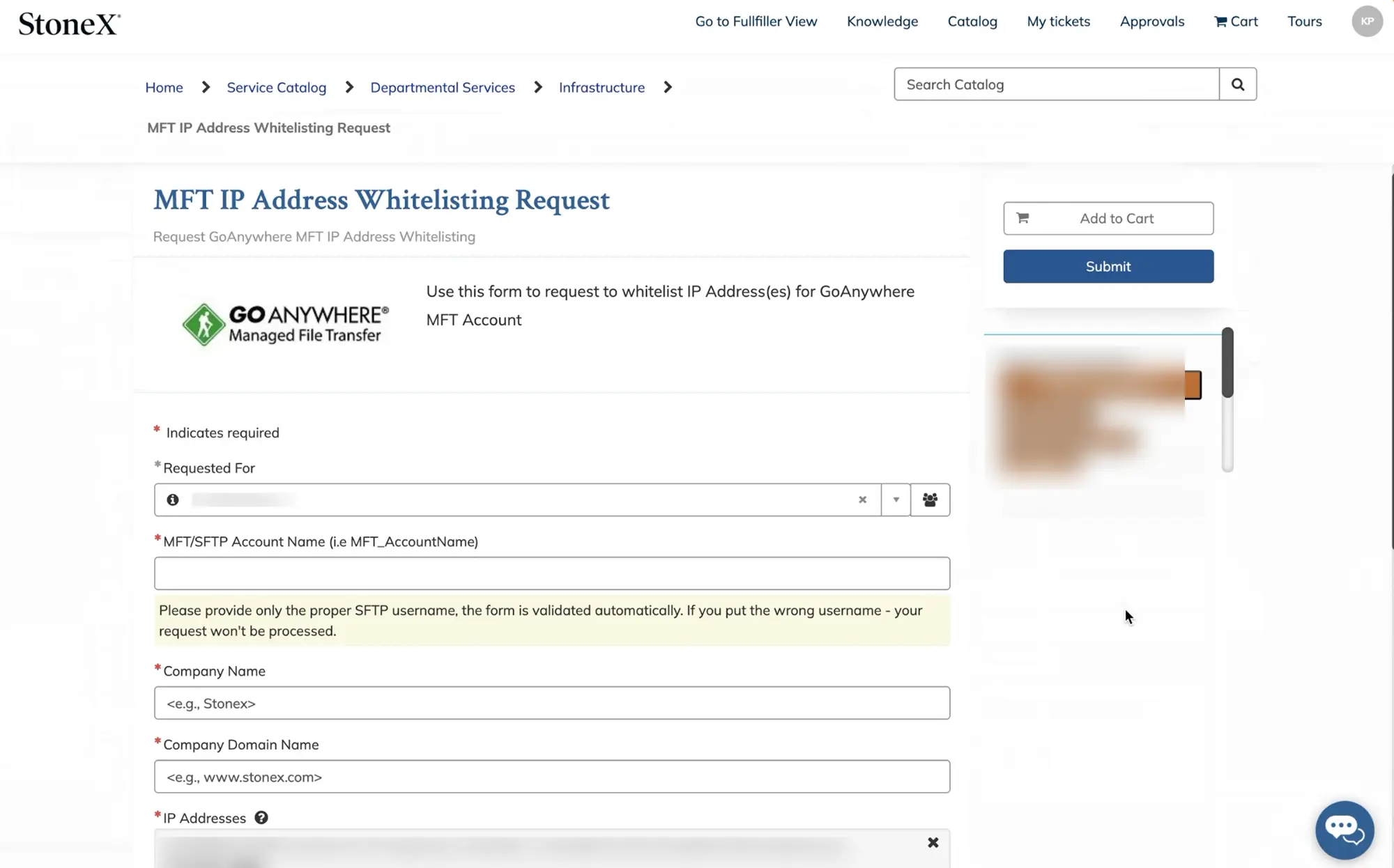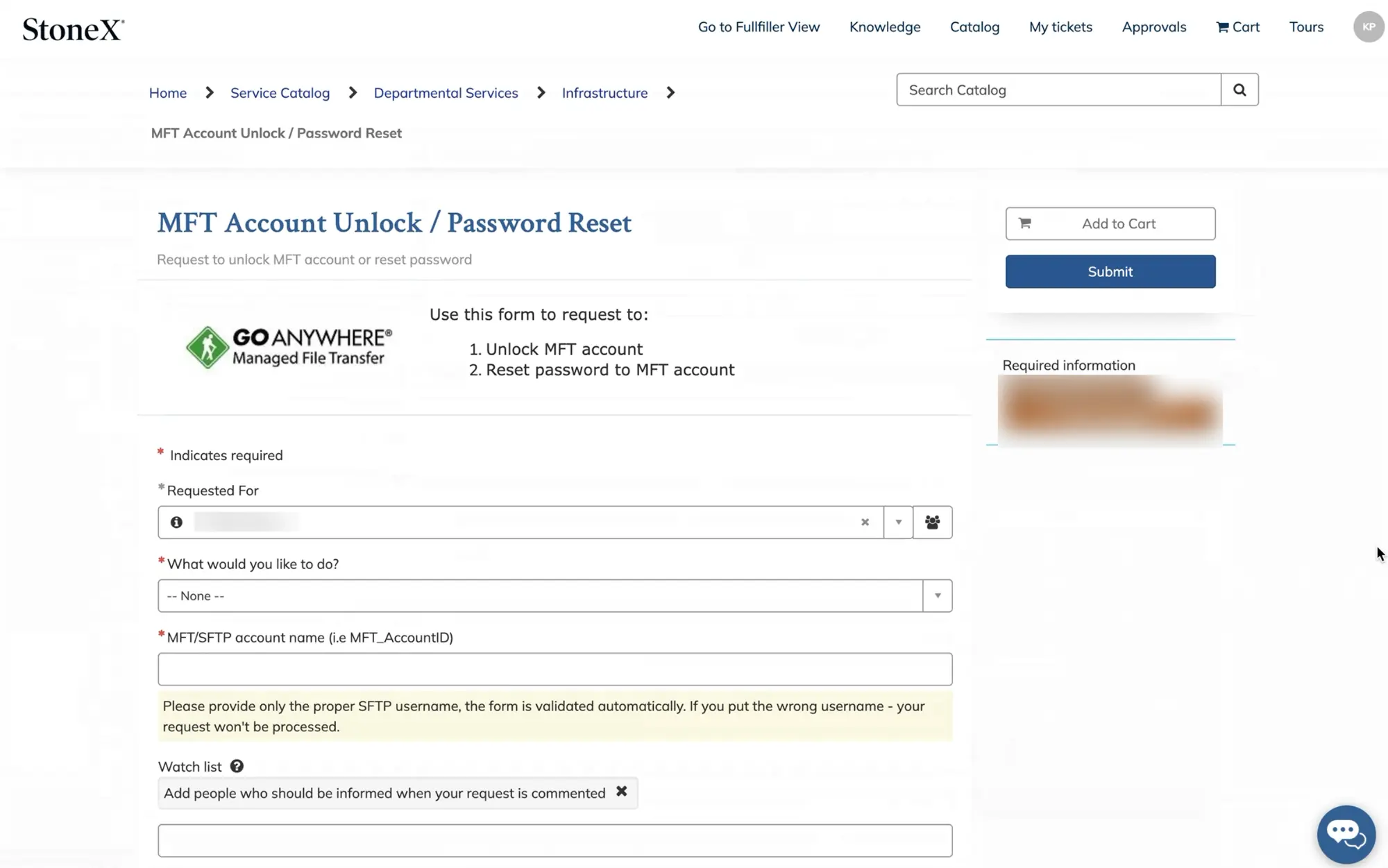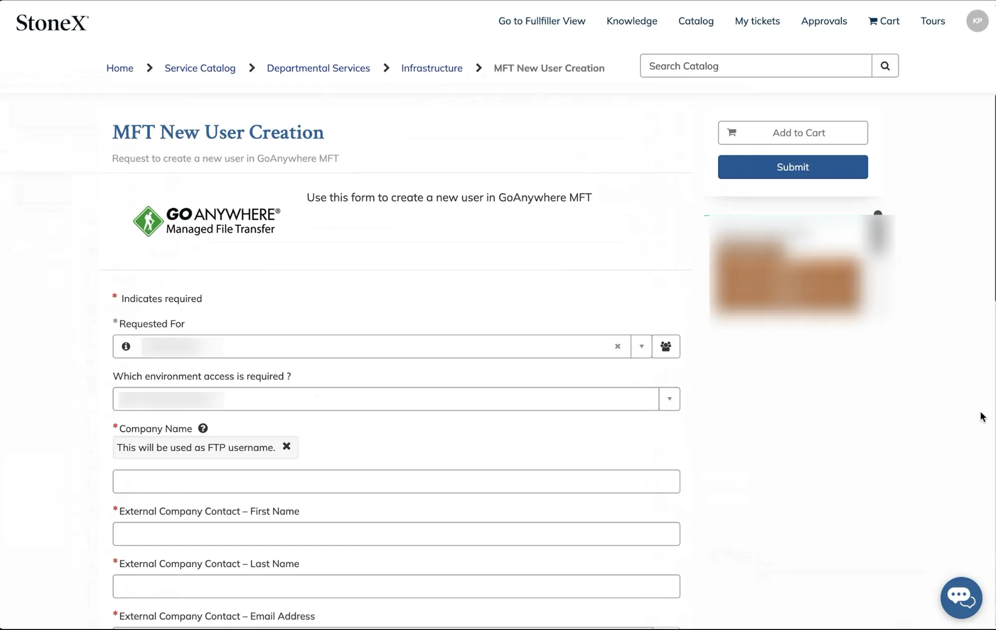 We built a form in ServiceNow that lets internal teams create new users for StoneX’s “GoAnywhere” Managed File Transfer (MFT) platform.